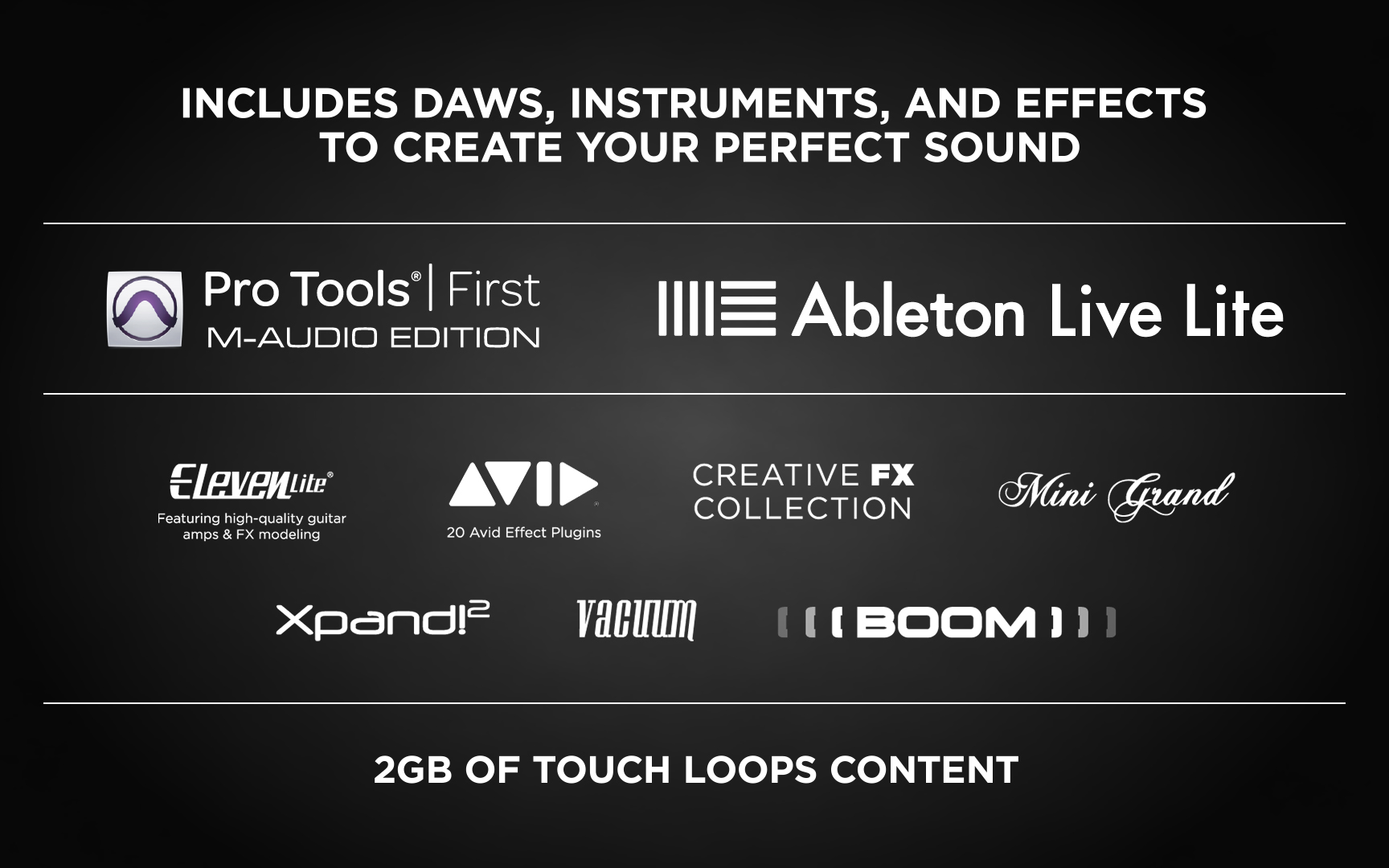 - Программное обеспечение: Pro Tools First M-Audio Edition,Ableton Live Lite,Eleven Lite,коллекция эффектов Avid, коллекция эффектов AIR Music Tech Creative,AIR Music Tech Xpand!2,AIR Music Tech Mini Grand,AIR Music Tech Vacuum, AIR Music Tech BOOM, 2GB сэмплов с Touch Loops