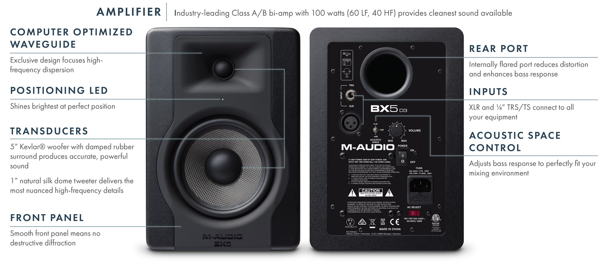 Каждый элемент M-Audio BX5-D3 тщательно проработан с единственной целью - дать уверенность в сведении материала. Монитор BX5-D3 имеет тыльный фазоинверторный порт, который заметно снижает навязчивую турбулентность воздуха, возникающую при воспроизведении баса при высоких уровнях звукового давления. Так же он имеет свойства не компрессировать глубокие низкие частоты.