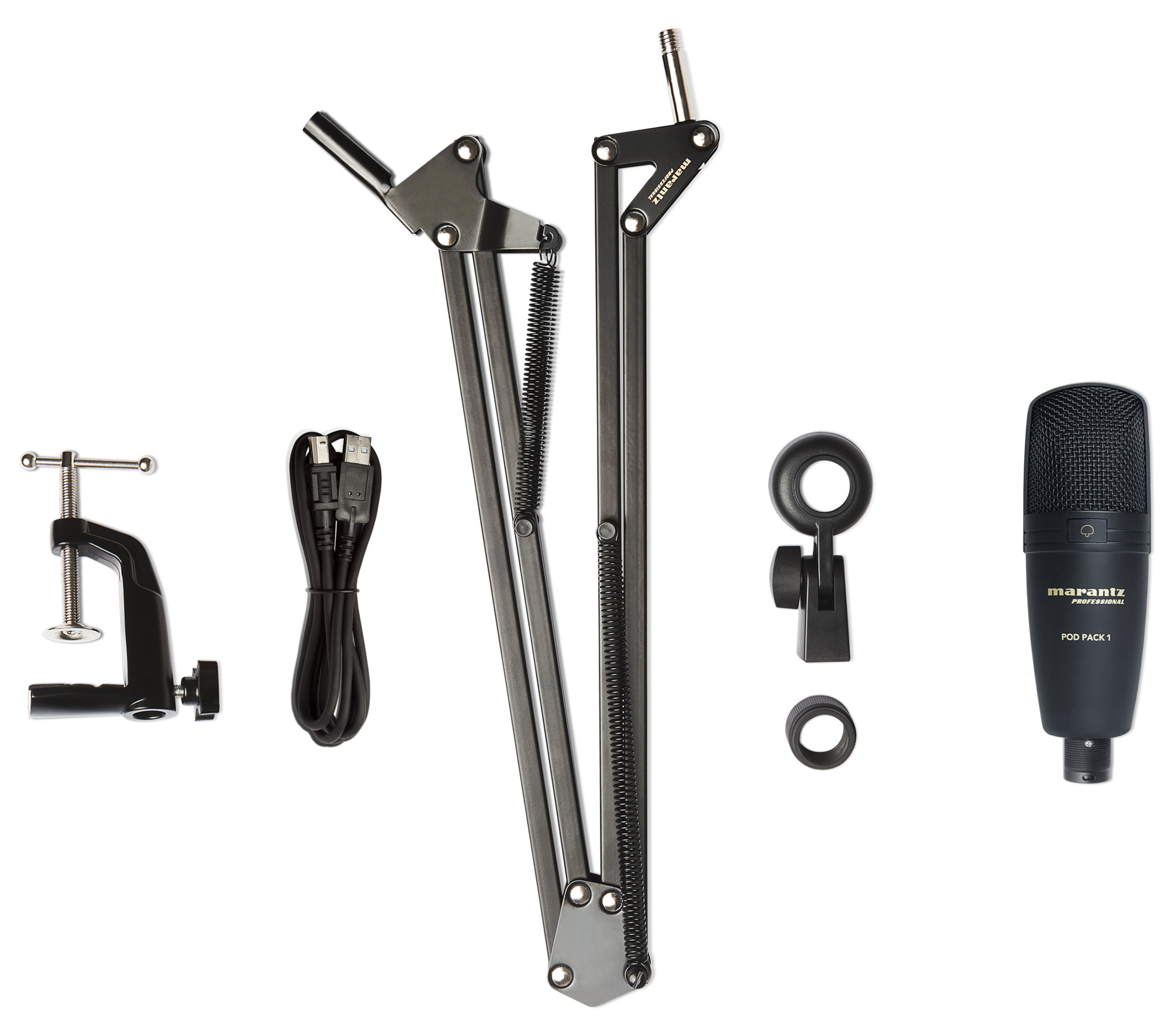 Marantz Pod Pack 1 - это профессиональное решение для стрима и вещания. Комплект состоит из высококачественного USB конденсаторного микрофона в паре с полностью регулируемым подвесным креплением типа «пантограф», обеспечивающим удобное положение микрофона для работы в прямом эфире, подкастинга или закадровой озвучки. Крепление надежно фиксируется с помощью зажима практически на любой поверхности стола.