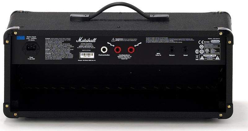 Также MG100HFX имеет выход с эмуляцией кабинета, что позволяет подключать к нему наушники для занятий дома, а также выводить сигнал на микшер, что делает его очень полезным в студийных условиях. На задней панели усилителя имеются два выхода Loudspeaker Out – это даёт возможность подключать как один кабинет, например MG412A, так и собрать полноценный стек Marshall, подключив к нему MG412A. Вдобавок ко всему, усилитель оснащён ещё и встроенным тюнером, разъёмом для ножного контроллера и входом для CD-проигрывателя или другого источника звука.