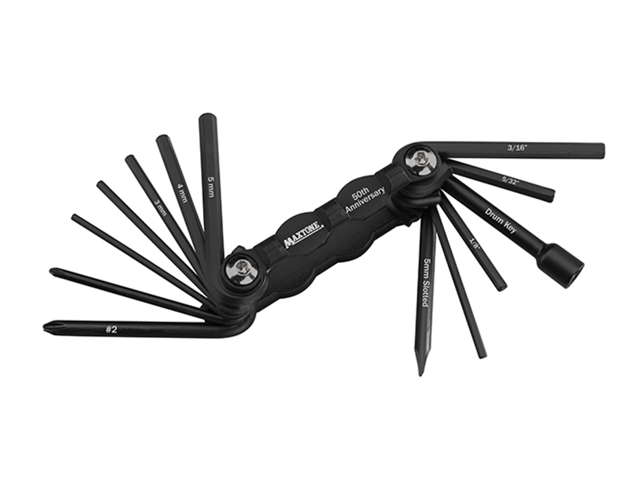 Цей пристрій поєднує в собі 13 корисних ключів і викруток, призначених для обслуговування барабанів, стійок, педалей і механіки в одному зручному форматі.