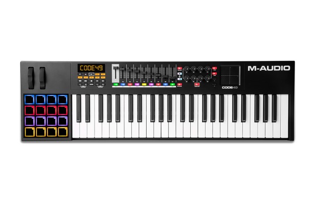 USB MIDI-клавиатура, 49 клавиш, чувствительная к скорость нажатия и послекасанию, 4 назначаемых кнопки, Octave +/- и Transpose, высота тона/модуляции, подключение 2 педалей, Mac и PC..