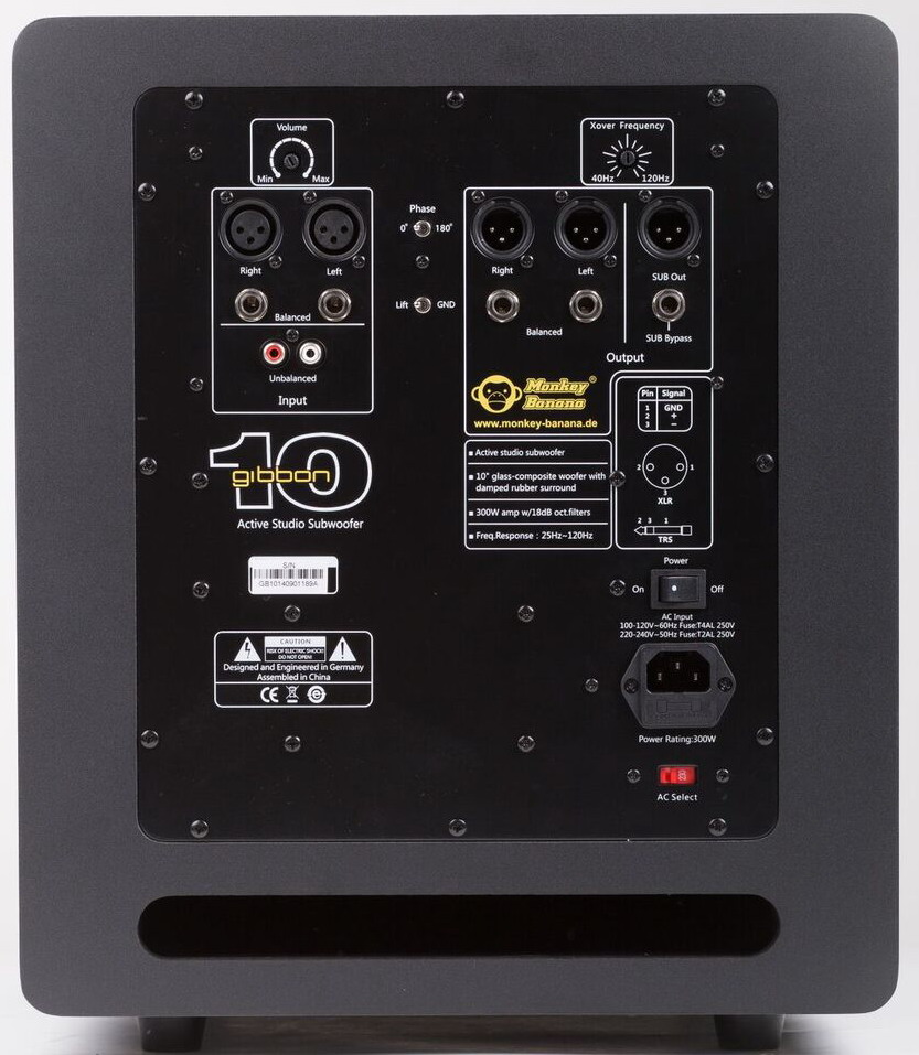 Monkey Banana Gibbon 10 - мощный активный сабвуфер для домашних контрольных и полупрофессиональных студий. Кроме того, сабвуфер является идеальным низкочастотным дополнением для DJ мониторинга. Сабвуфер Gibbon 10 прекрасно сочетается со всеми моделями Gibbon, благодаря регулируемой частоте кроссовера. Сабвуфер может использоваться как в профессиональных студиях, так и в неподготовленных акустически помещениях.