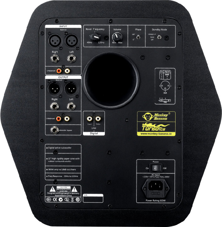 Monkey Banana Turbo 10 - мощный активный сабвуфер для контрольных аппаратных и профессиональных студий. Кроме того, он является идеальным низкочастотным дополнением для DJ мониторинга. Сабвуфер Turbo 10 прекрасно сочетается со всеми моделями Turbo благодаря регулируемой частоте кроссовера.