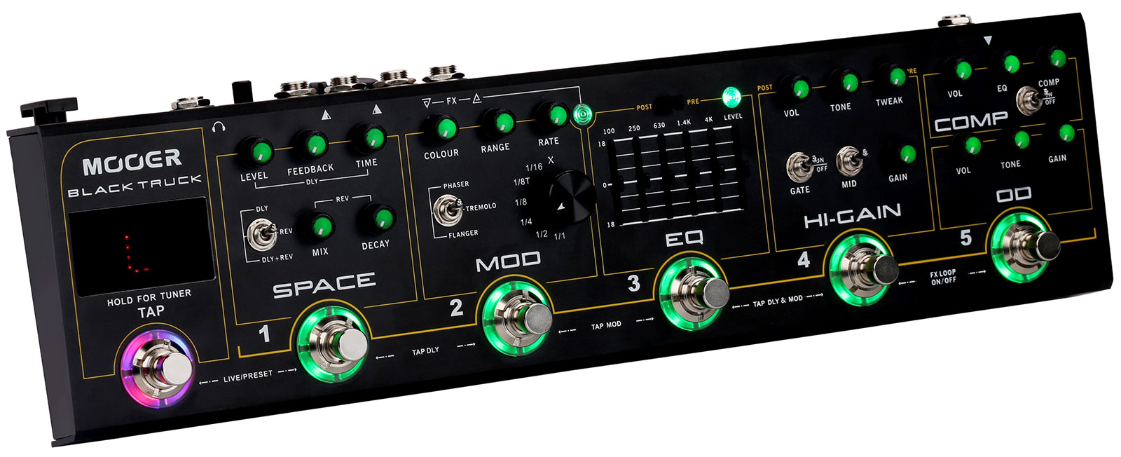 Дуже універсальний та практичний Black Truck, заснований на популярних аналогових педалях серії Micro Series (модулі Compressor, Overdrive і EQ). Він підходить для будь-якого музичного стилю. Цілком новий потужний аналоговий хай-гейн дісторшн, спеціально створений для Black Truck, ще більш розширює тембральні можливості вашої музики. Цифрові модулі модуляції (Mod) та просторової обробки (Space) додають вашому звучанню насиченість та об'єм.