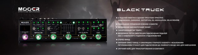 Продовжуючи розвивати концепцію, що була успішно реалізована в моделі Red Truck, компанія Mooer представляє вашій увазі нову "швейцарсьнкий ніж гітариста" - Black Truck. Як і у будь-якому учаснику лінійки Truck, він включає в себе перевірені часом схеми популярних гітарних педалей, разом із точним тюнером, петлею для підключення ефектів FX loop, яку можна вимкнути, та окремим виходом з симуляцією гітарного кабінету. Усе це представлено у компактному та легкому в управлінні пристрої, який міцно поміститься в кишені гітарного чохла.