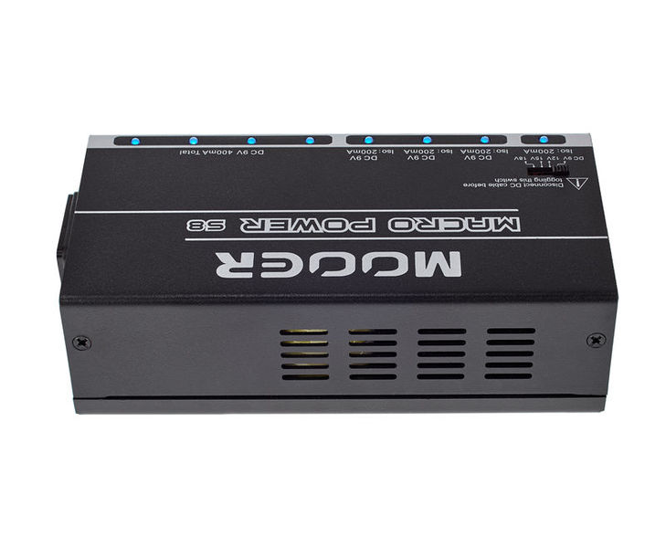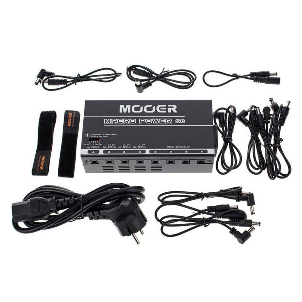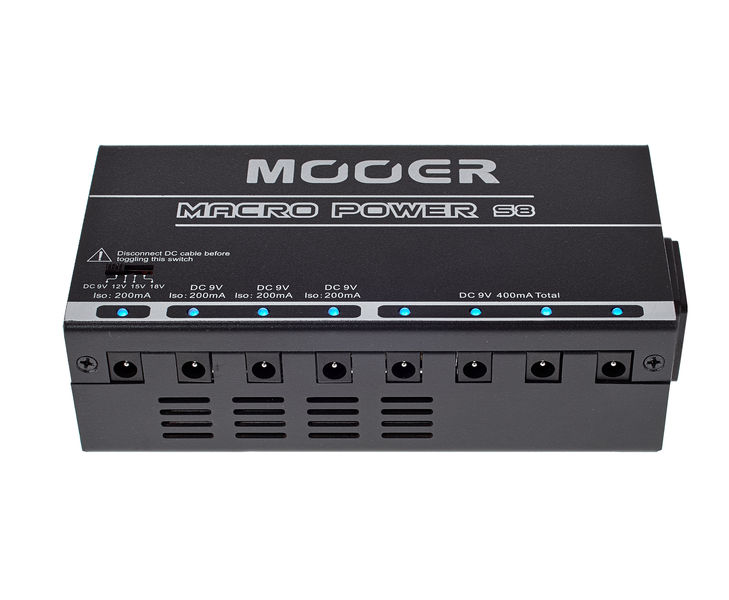 Mooer Macro Power S8 - це блок живлення для гітарних педалей, який має 8 ізольованих виходів з можливістю регулювання напруги і вбудованим захистом від перевантаження. Кожен вихід обладнаний синім LED світлодіодом для показу статусу живлення.