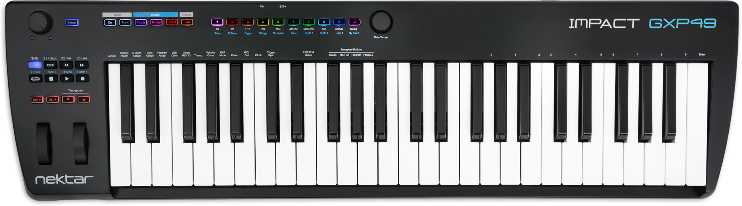 Nektar GXP49 представляет собой 49-клавишный USB-MIDI контроллер с функцией быстрого доступа к элементам управления инструмента, включая механизм повтора в реальном времени, мощное управление в Nektarine и полной интеграцией с Nektar DAW. Организация кнопок панели управления, хорошо подходит для студии, т.к. основана на серии Impact GX. Версия GXP по функционалу максимально сгрупирована для сценического выступления.