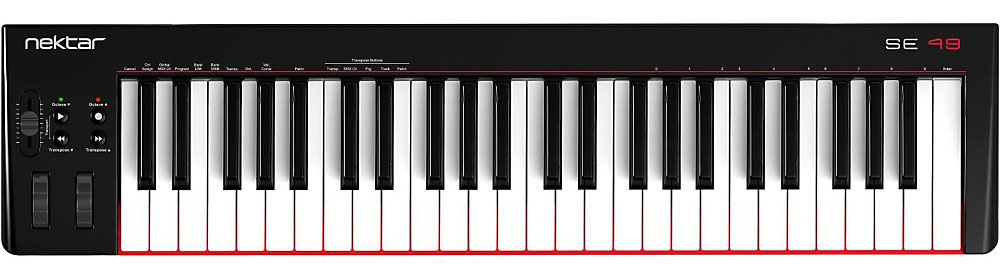 Nektar SE49 это полноразмерный USB MIDI-контроллер с 49 полноразмерными клавишами, колесиками Ptch-bend и модуляции, а также с возможностью использования ножного переключателя. SE49 оснащен кнопками переключения октав, что позволяет транспонировать звучание на 3 октавы вниз или на 4 вверх.