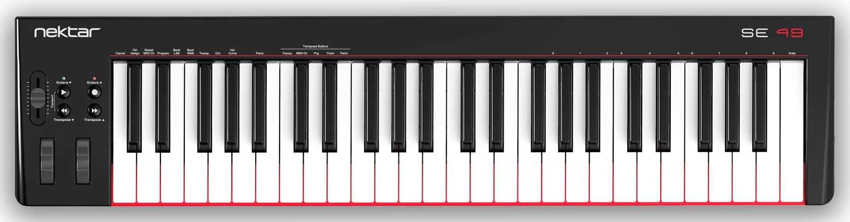 Nektar SE61 полноразмерная версия USB MIDI-контроллера с 61 клавишей чувствительных к скорости, колесами Ptch-bend и модуляции, а также с возможностью использования ножного переключателя. SE61 оснащен кнопками переключения октав, что позволяет транспонировать на 3 октавы вниз или на 4 вверх.