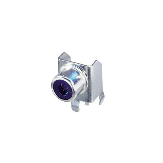 Стандартный панельный RCA разъем типа «мама» c позолоченными контактами, синим изолятором в металлическом корпусе с гайкой для фиксации.