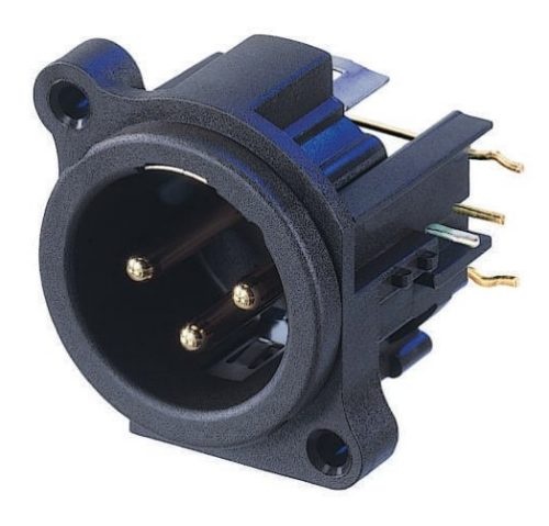 Профессиональный 3-х контактный панельный разъем XLR типа «папа» под монтаж на шасси с бронзовыми контактами покрытыми золотом, раздельное заземление, правосторонний монтаж.