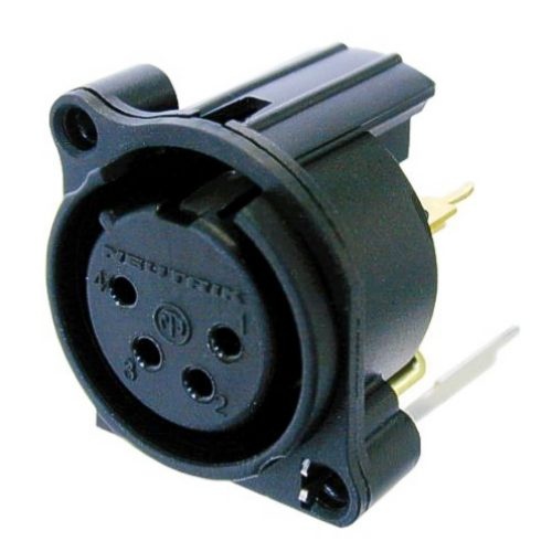 Профессиональный 4-х контактный панельный разъем XLR типа «мама» под монтаж на шасси с стальной пружиной вместо защелки и бронзовыми контактами покрытыми золотом, вертикальный монтаж.