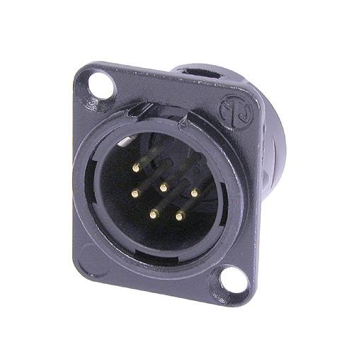Профессиональный 6-контактный панельный разъем XLR типа «папа» под монтаж на шасси с бронзовыми контактами покрытыми золотом, контакты под пайку, черный стальной корпус.