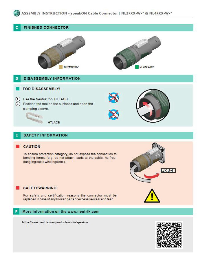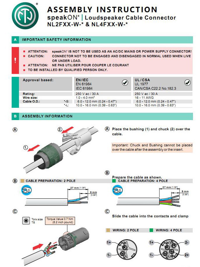 Новая линейка FXX series пришла на замену SPX Series. Сохранена прежняя конфигурация 2-/4-контактных кабельных коннекторов SpeakON, с прочными контактами и винтовыми клеммами, включая подсоединение многожильных проводов, которые необходимо паять. Фиксатор-цанга зажимного типа расчитан на кабель диаметром от 6 до 12 мм.