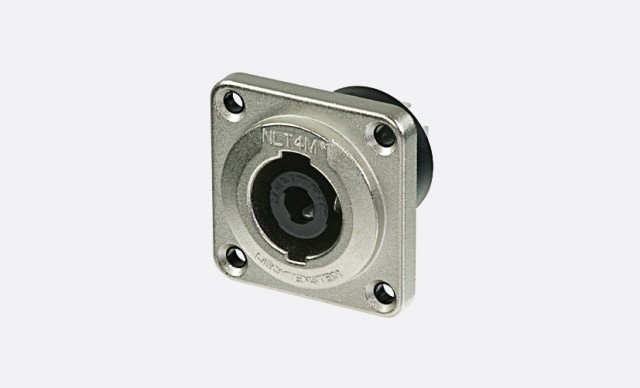 Профессиональный панельный 4-контактный SpeakON разъем типа «папа» c металлическим корпусом серии G покрытым никелем и посеребренными контактами, ток до 30 А, выход под клеммы «мама» 1/4" FASTON® (6.3x0.8 мм)