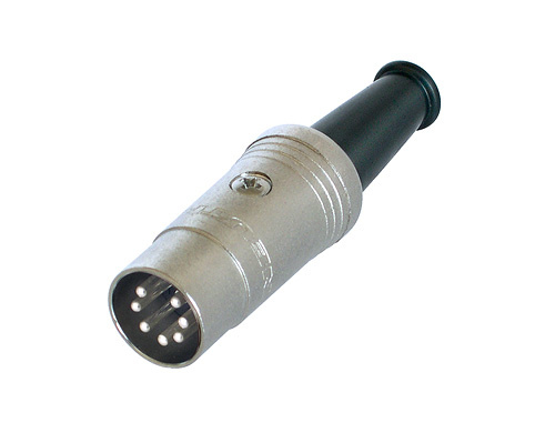 7-контактный DIN/ОНЦ-ВГ-11-7/16-В(СШ-7) коннектор типа «папа» c посеребренными контактами под пайку, зажимным устройством для кабеля, резиновой манжетой и металлическим корпусом с никелевым покрытием.