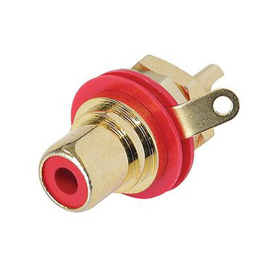 Панельно монтируемый RCA разъем типа «мама» c позолоченными контактами под пайку, красным изолятором в металлическом корпусе с зажимной гайкой для фиксации.