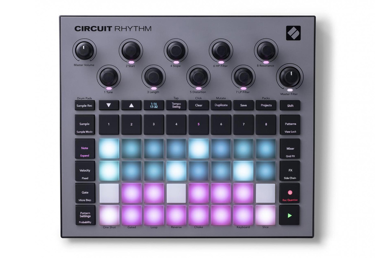 Novation Circuit Rhythm - это автономный семплер, созданный специально для битмейкеров. Данный грувбокс располагает 8 каналами и встроенными эффектами. Управление и программирование партий происходит при помощи 32 пэдов RGB, чувствительных к силе нажатия, а управление параметрами и редактирование семплов — с помощью 10 энкодеров с RGB подсветкой. Записывайте сэмплы прямо на оборудование, а затем без труда нарезайте, склеивайте и формируйте свои звуки.