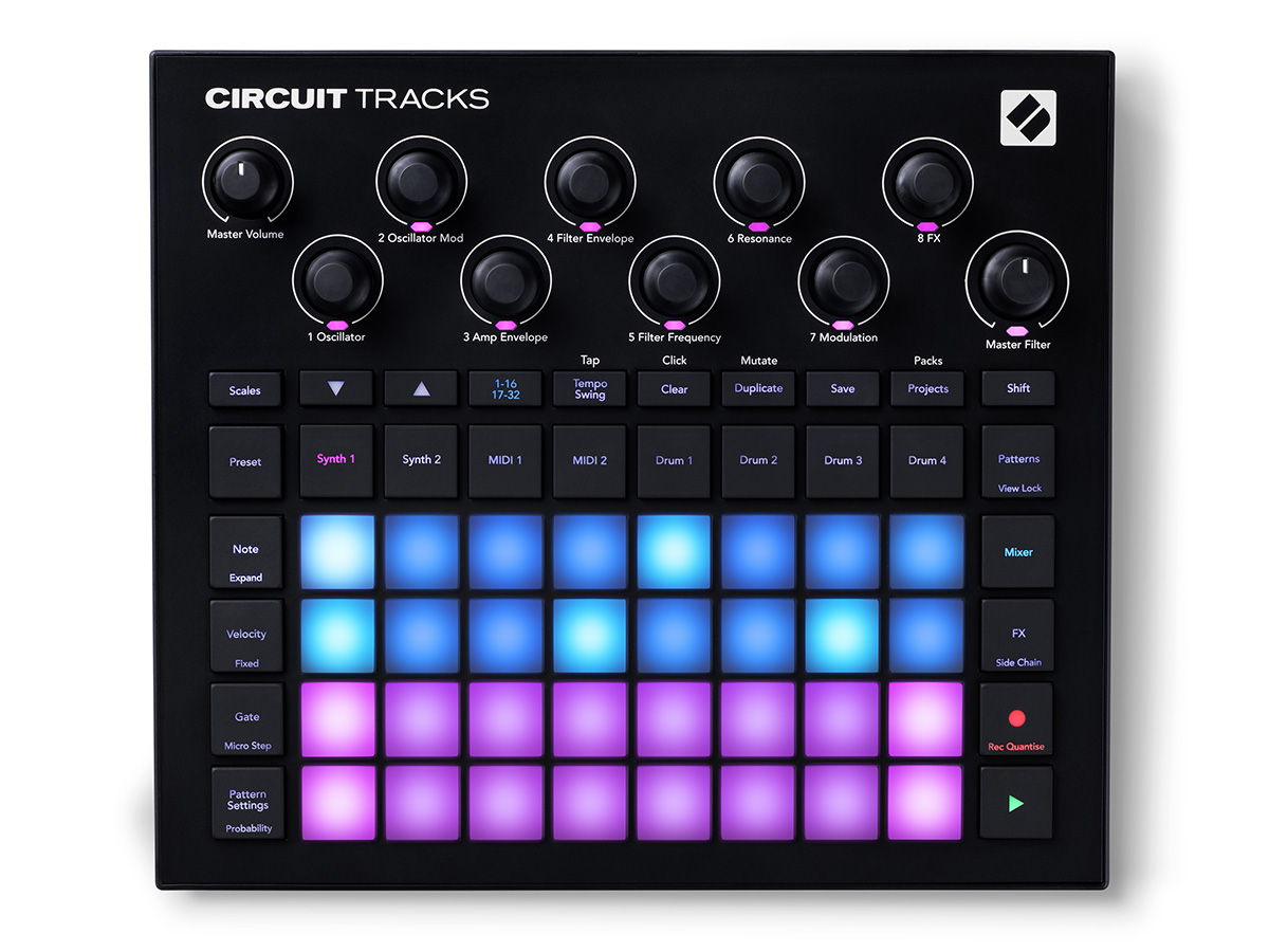 Novation Circuit Tracks - это прогрессивный грувбокс с 2-мя цифровыми полифоническими движками, семплером,секвенсором и встроенными эффектами. Модель оснащена 32 RGB пэдами, а функции и раскладку пэдов можно изменять прямо с фронтальной панели. Секция обработки и генератора включает 2 осциллятора и генератор шума, секцию фильтров, три огибающих и 2 LFO-осциллятора с максимальной полифонией 6 голосов.