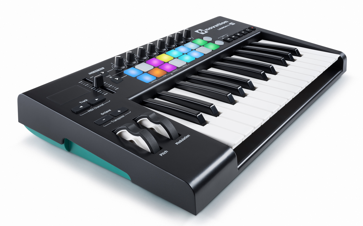 Компактный MIDI контроллер с USB интерфейсом для iPad и компьютера, 25 velocity-sensitive клавиш, 16 RGB чувствительных пэдов, 8 назначаемых регуляторов, колеса высоты тона и модуляции.