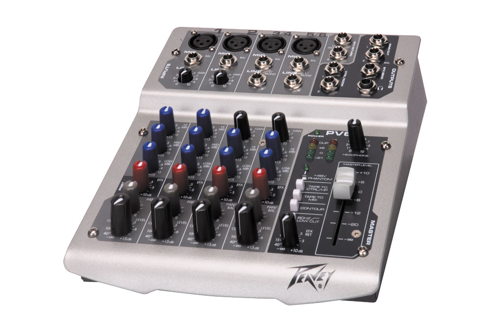 Пассивный 6-ти канальный микшер, 4 низкошумных микрофонных входа; каналы 3 и5 с линейным стерео входом; 3-х полосный EQ на каналах 1-2, индикация сигнала и перегрузки, 1 стерео посыл на эффект, 1 стерео возврат, выход на контрольные мониторы.