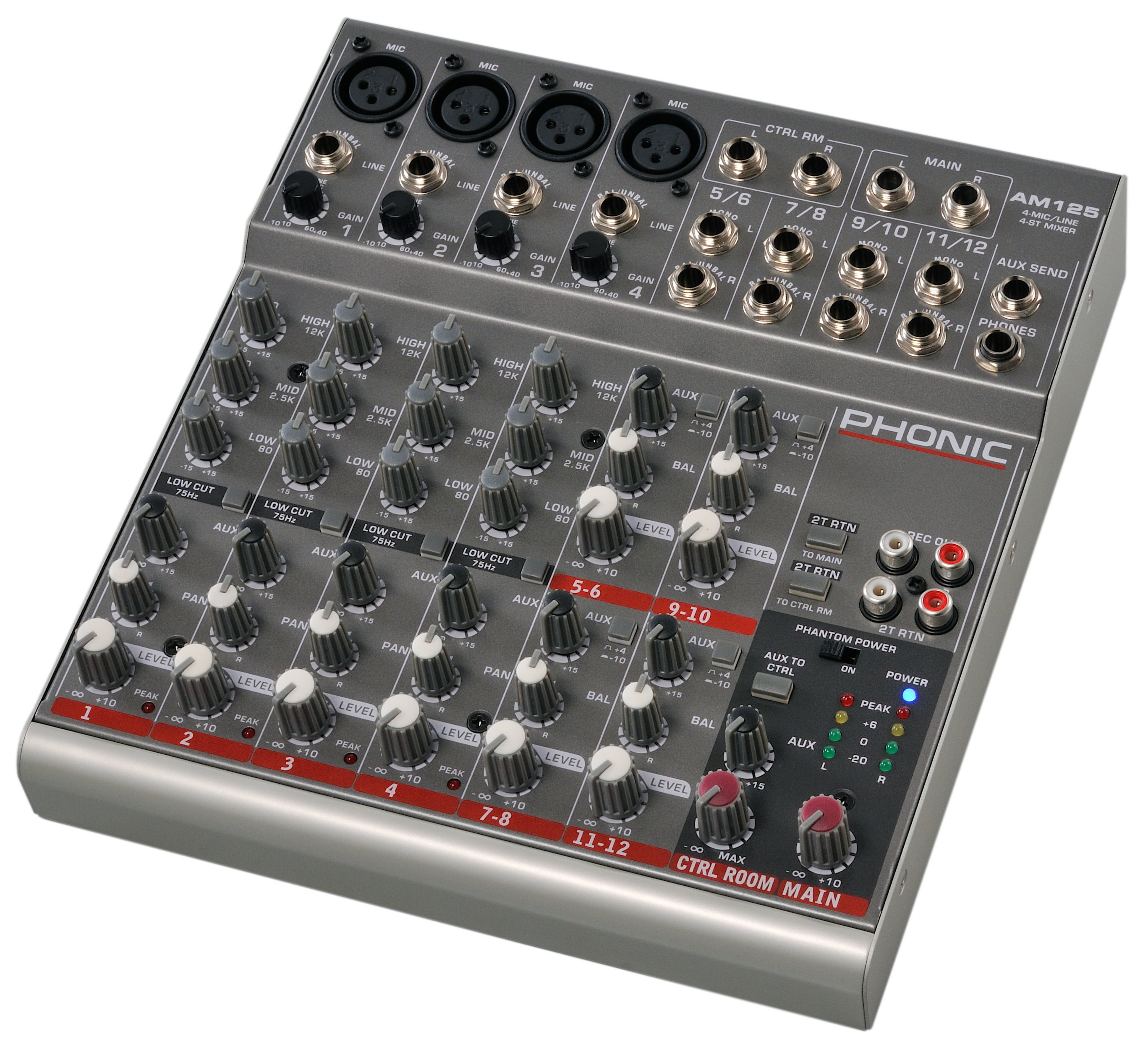 Phonic AM 125 - аналоговый микшерный пульт. Моно каналы оборудованы отключаемым high pass фильтром, отсекающий частоты ниже 75Hz (18 dB/окт), что обеспечивает удаление нежелательных шумов и низкочастотных наводок. Стерео каналы имеют переключатель входной чувствительности +4/-10 дБ.