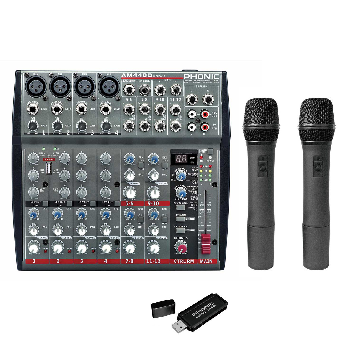 AM 440 D USB-K-2 - аналоговый микшерный пульт со встроенным процессором эффектов, музыкальным проигрывателем c USB портом и двумя Wi-Fi радиомикрофонами с USB приемником в комплекте. Моно каналы оборудованы отключаемым high pass фильтром, отсекающий частоты ниже 75Hz (18 dB/окт), что обеспечивает удаление нежелательных шумов и низкочастотных наводок. Все стерео каналы имеют переключатель входной чувствительности (+4/-10 dB).