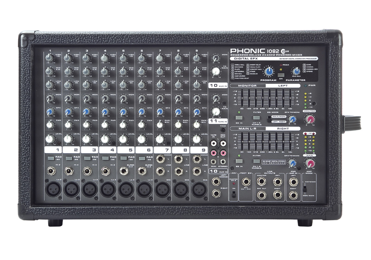 Powerpod 1082 Plus - активный 10-канальный микшерный пульт. Входные разъемы XLR и 1/4 TRS Jack, предназначенные для подсоединения как микрофонов, так и других источников сигнала. На каждом канале предусмотрен 3-х полосный эквалайзер. С помощью разъемов RCA можно подключить магнитофон или CD проигрыватель. Имеется также цифровой 32/40-битный процессор эффектов на 16 программ.