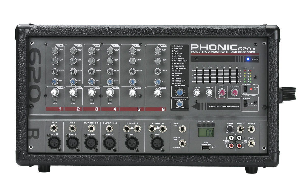 Powerpod 620 R - активный 6-канальный микшерный пульт оснащенный цифровым рекордером с USB интерфейсом, который также позволяет воспроизводить аудио файлы. Входные разъемы XLR и 1/4 TRS Jack, предназначенные для подсоединения как микрофонов, так и других источников сигнала. На каждом канале предусмотрен 2-х полосный эквалайзер. С помощью разъемов RCA можно подключить магнитофон или CD проигрыватель, сигнал с которого направляется напрямую к главному выходу. Имеется также цифровой 32/40-битный процессор эффектов на 100 программ. Пульт обладает достаточной мощностью для озвучивания небольших мероприятий и репетиций.