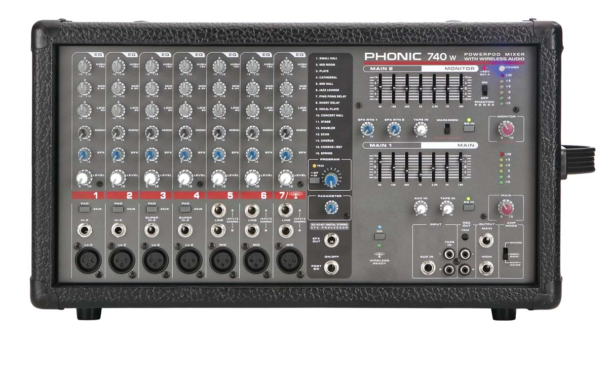 Powerpod 740 W - активный 7-канальный микшерный пульт оснащенный встроенным 2.4 ГГц модулем Bluetooth для воспроизведения аудио. Входные разъемы XLR и 1/4 TRS Jack, предназначенные для подсоединения как микрофонов, так и других источников сигнала. На каждом канале предусмотрен 3-х полосный эквалайзер. С помощью разъемов RCA можно подключить магнитофон или CD проигрыватель, сигнал с которого направляется напрямую к главному выходу. Имеется также цифровой 32/40-битный процессор эффектов на 16 программ. Пульт обладает достаточной мощностью для озвучивания небольших мероприятий и репетиций.
