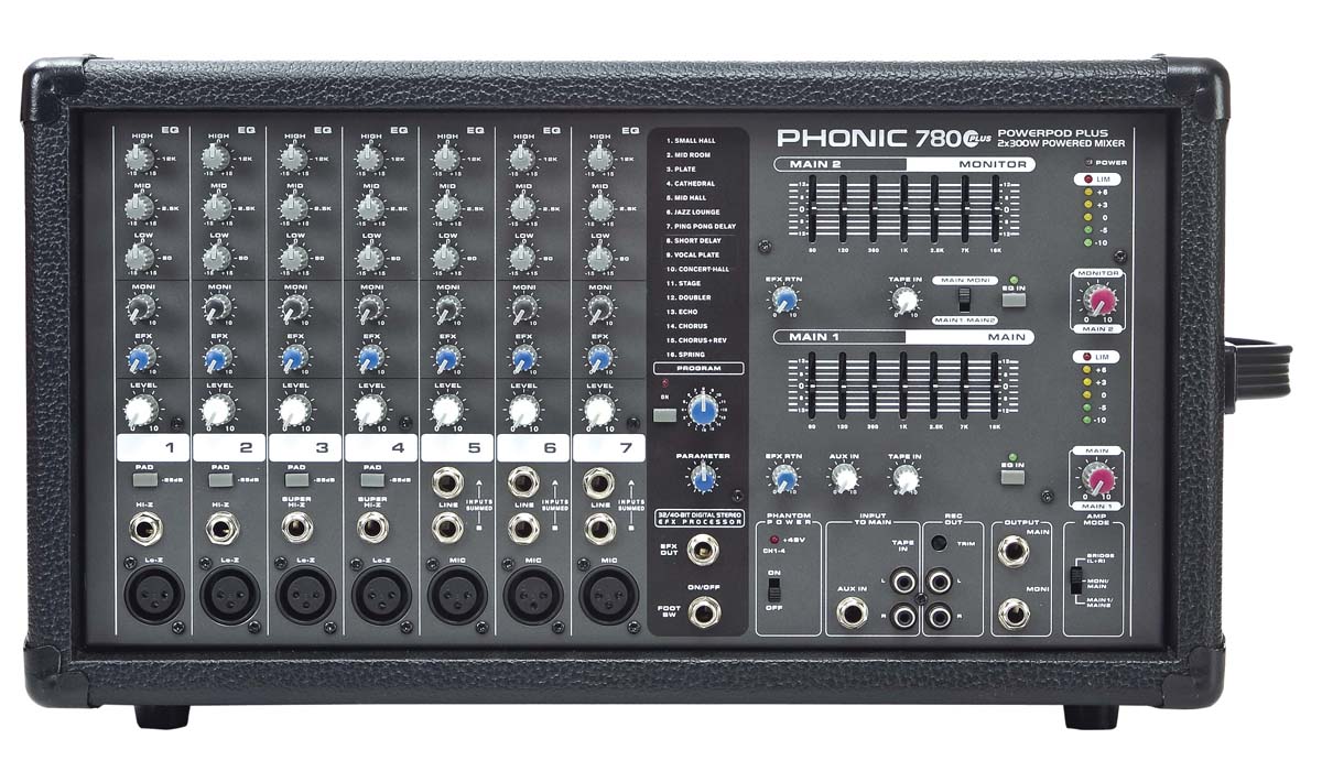Powerpod 780 Plus - активный 7-канальный микшерный пульт. Входные разъемы XLR и 1/4 TRS Jack, предназначенные для подсоединения как микрофонов, так и других источников сигнала. На каждом канале предусмотрен 3-х полосный эквалайзер. С помощью разъемов RCA можно подключить магнитофон или CD проигрыватель, сигнал с которого направляется напрямую к главному выходу. Имеется также цифровой 32/40-битный процессор эффектов на 16 программ. Пульт обладает достаточной мощностью для озвучивания небольших мероприятий и репетиций.