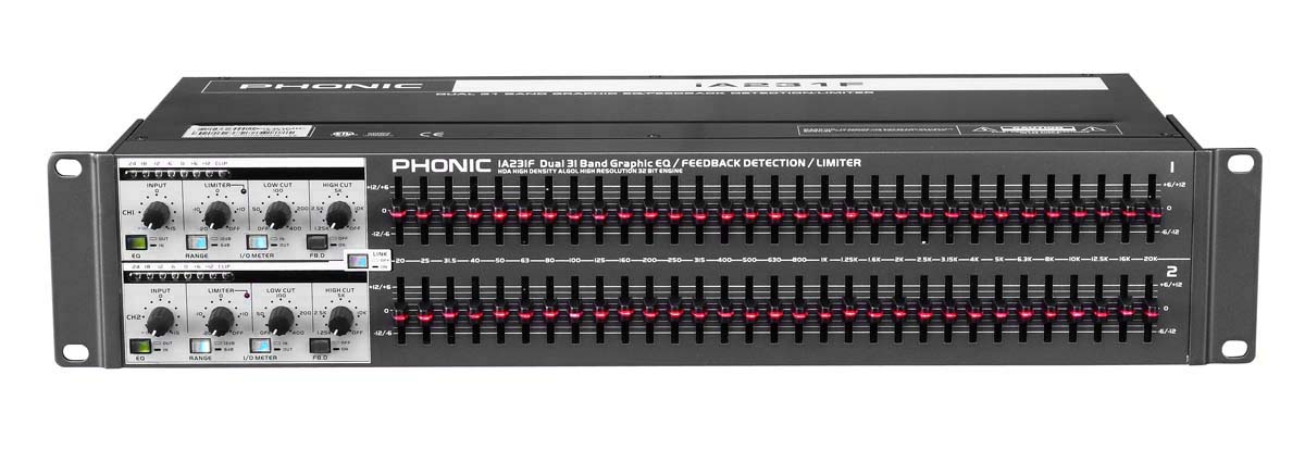 Phonic IA231F - 31 полосный графический эквалайзер имеет детектор обратной связи, которую может переводить в bypass. В активном режиме feedback ищет обратную связь и помогает подавить ее. Когда обратная связь обнаруживается - подсвечивается светодиод на ползунке полосы частот. Светодиод горит, пока обратная связь не будет устранена, давая вам важную информацию, необходимую для выравнивания обратной связи в комплексе.