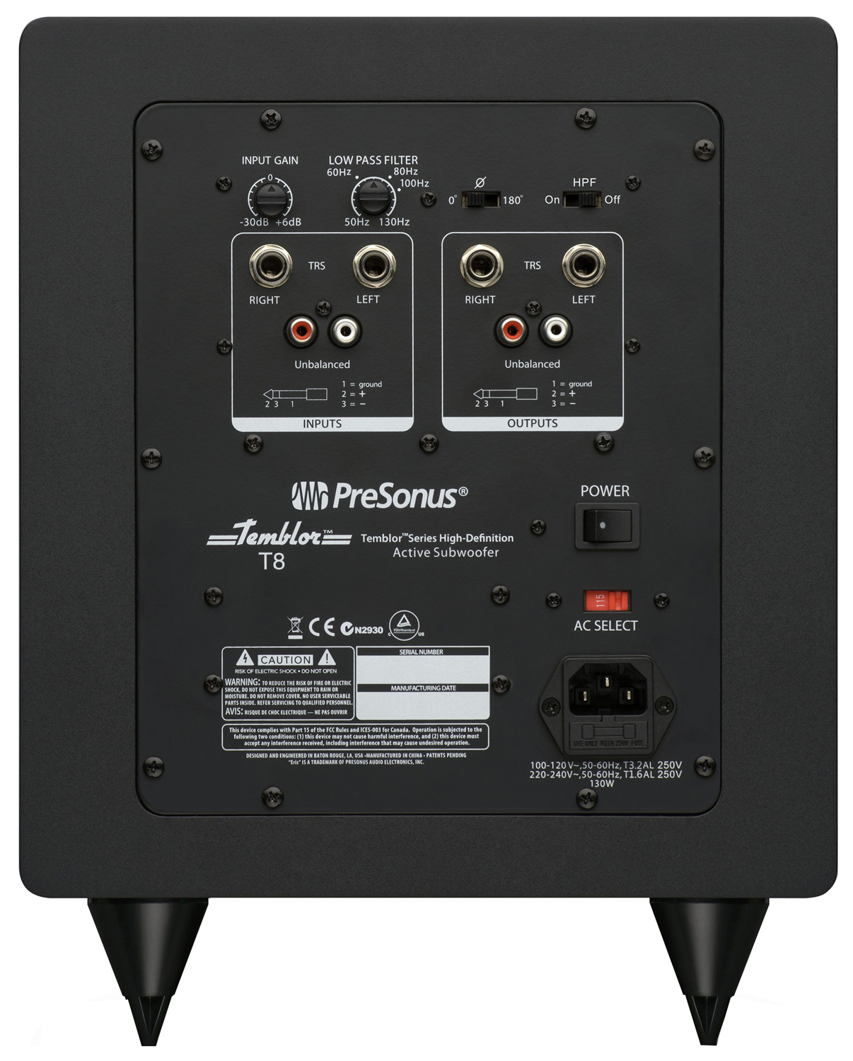 На задней панели Temblor T8 имеются элементы управления, которые включают входное усиление (-30 дБ до +6 дБ ) и бесступенчатый НЧ-фильтр (50 Гц до 130 Гц ), что позволит создавать бесшовный переход кроссовера между студийными мониторами и сабвуфером для более точного мониторинга. Переключаемый ФВЧ удаляет частоты ниже 80 Гц от сигнала во всем диапазоне с выходов основных монитор, избегая искажений в верхнем диапазоне. В дополнение сабвуфер оснащен инвертированием фазы.