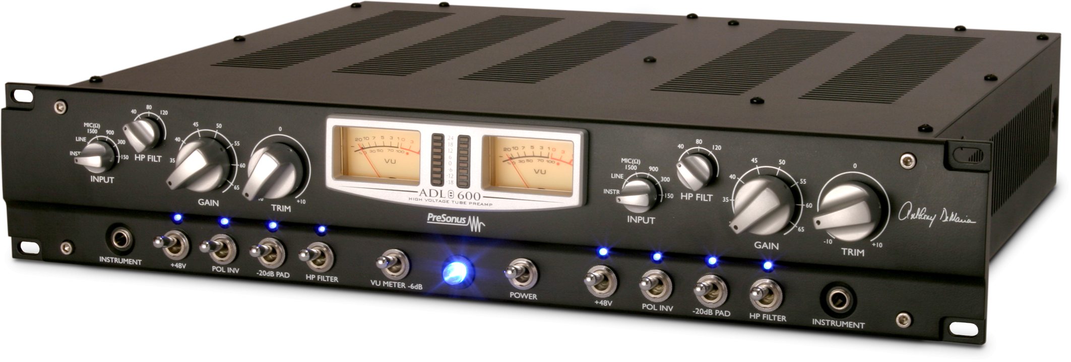 Presonus ADL 600 - это ламповый высоковольтный микрофонный предусилитель с двумя каналами. В ADL 600 используется схематика класса A, с дискретными компонентами и тремя топовыми вакуумными лампами на канал, работающими при напряжении анода ± 300В от шин питания для минимального уровня шума тракта и для превосходного звучания. Применение двойного трансформатора позволило получить самый минимальный уровень собственных шумов при максимальном понижении синфазного сигнала. В результате объединения триодных ламп 12AT7A и 6922, позволило получить большой запас по перегрузке, что в свою очередь делает звучание максимально открытым и невероятно мягким.