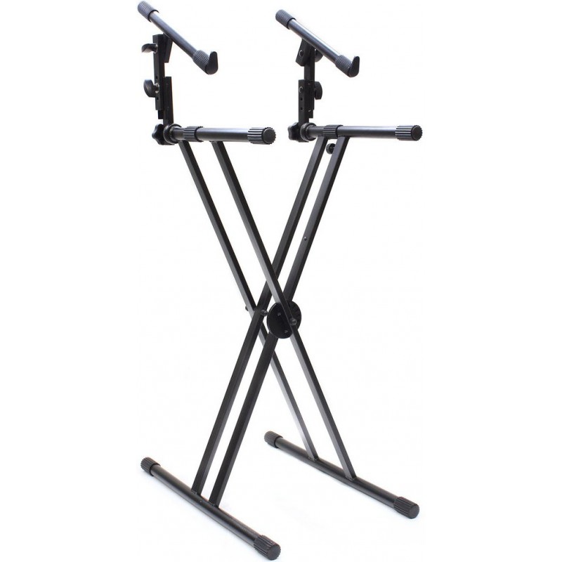Двойная Х-образная стойка под два клавишных инструмента, нагрузка до 120 кг (до 33.7 кг на верхний ярус), штифтовой фиксатор - сектор, глубина: 66 см, высота 584 - 964 мм, вес: 10 кг.