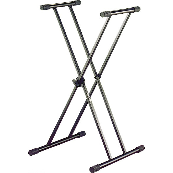 Двойная Х-образная стойка для клавишных инструментов, нагрузка до 81 кг, зубчатый фиксатор-замок Dino-Bite, глубина: 50 см, глубина уровня 36 см, высота в сложенном виде 98 см, вес: 4 кг.