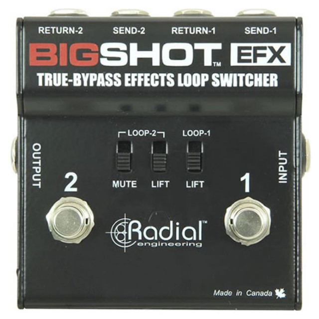 Radial Big Shot EFX – представляет собой высококлассную педаль, отвечающую за функцию посылов. Имеет два посыла-возврата последовательного типа (две пары несимметричных Jack), два педальных переключателя (металлические кнопки) обхода посылов-возвратов, несимметричные вход и выход (Jack).