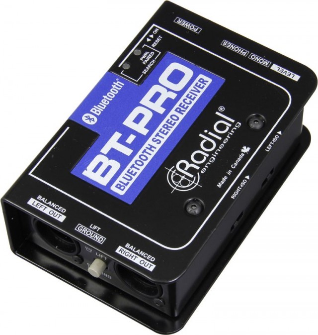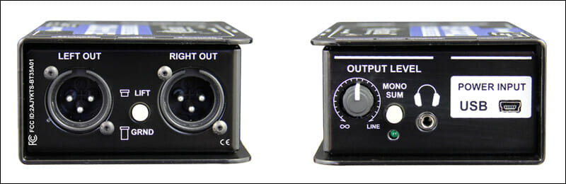 Активный BlueTooth приемник DI-box, балансные XLR стерео выходы, переключатель моно-суммы, 3.5 мм выход, Ground-lift.