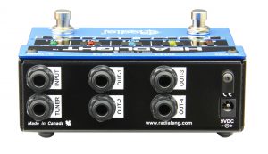Педаль коммутатор, 4 Jack выхода, 1 Jack вход, Jack выход на тюнер, корректор уровня сигнала на 1 канале, переключатель MUTE на все каналы, переключатели заземления, инверсия фазы.