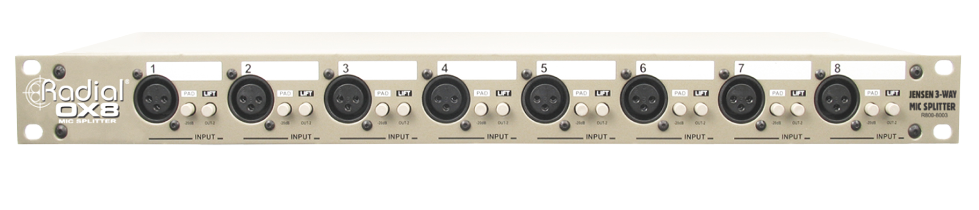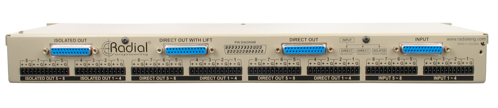 8 канальный пассивный сплиттер, 8 входов, 8-direct/8-isolated выходов, трансформаторы Radial, поддержка фантомного питания +48V, аттенюатор -36 дБ, D-Sub 26 разъем, euroblock гнезда.