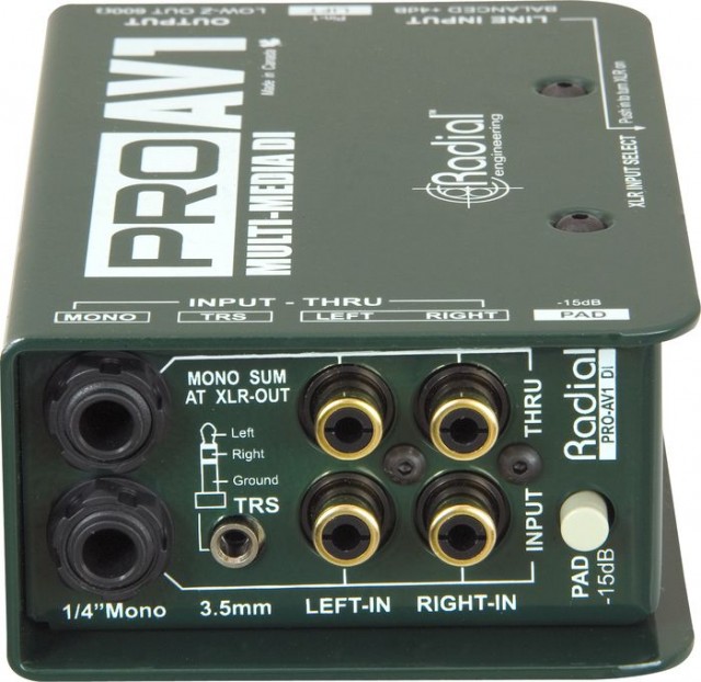 Radial Pro AV1 - пассивный директ-бокс, специально разработанный для подключения аудио-видео устройств. Для удобства и широкого применения устройство оснащено входами 1/4" Jack и RCA для подключения ноутбуков, DVD-проигрывателей и MP-3 плееров.