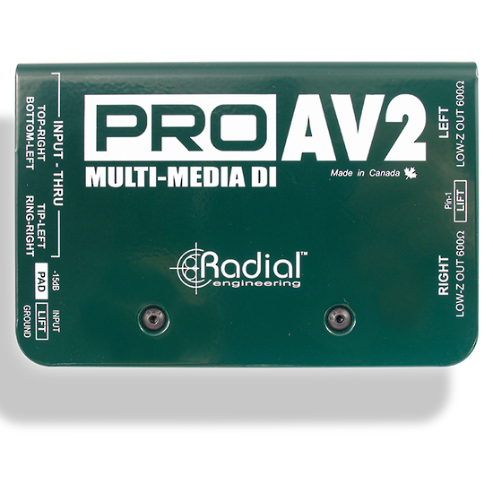 Radial Pro AV2 - пассивный стерео директ-бокс, специально разработанный для подключения аудио-видео устройств. Для удобства и широкого применения устройство оснащено входами 1/4" Jack и RCA для подключения ноутбуков, DVD-проигрывателей и MP-3 плееров.