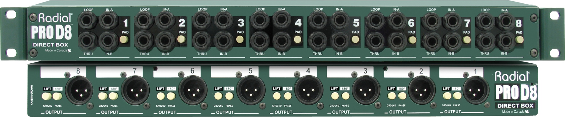 ProD8 оснащен 8-каналами в стандартном габарите 19 Rack высотой 1U. На каждом выходе предусмотрено 2 входа 1/4 Jack, что позволяет дублировать сигнал до 16 каналов. Разъемы Loop на каждом канале позволяют подключать различные устройства эффектов или дополнительных линий маршрутизации, в то время как сквозной канал (Thru) обеспечивает прямую передачу сигнала.