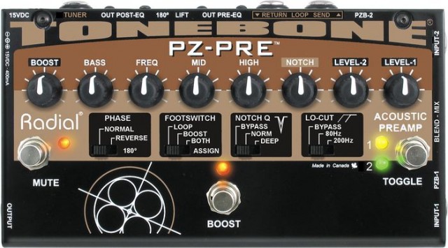 Педаль-предусилитель для акустической гитары, скрипки и других акустических инструментов, 2 канала, эквалайзер, блок питания в комплекте.