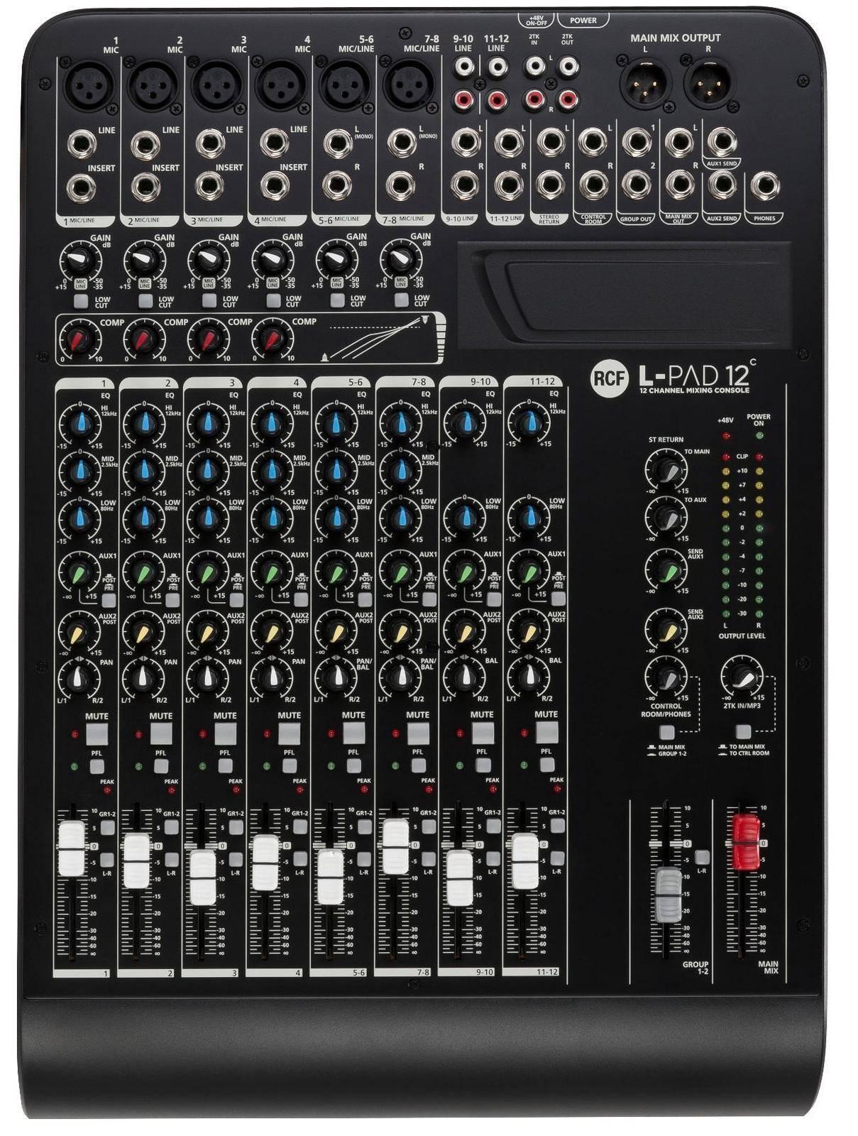 L-PAD PAD12C рабочий инструмент для репетиционных баз, проката и концертов. Пульт имеет 6 микрофонных входов, 4 стереофонических линейных входа/выхода, а также 2TRACK вход/выход, 1 AUX PRE/POST посыл, 1 FX посыл и 2 выхода AUX. 4 компрессора с единым управлением на микрофонных линейках позволяют обработать сигнал.