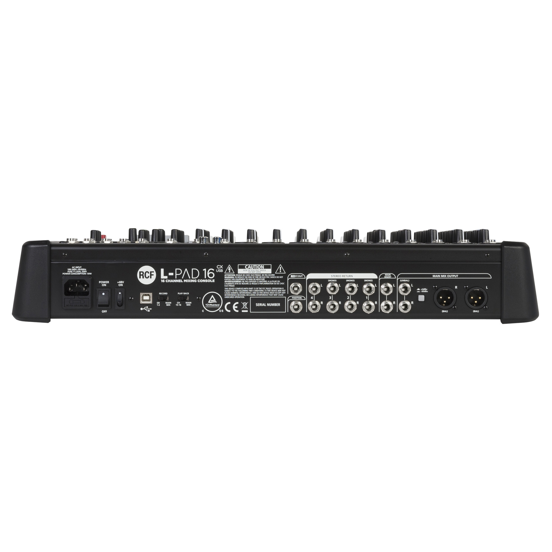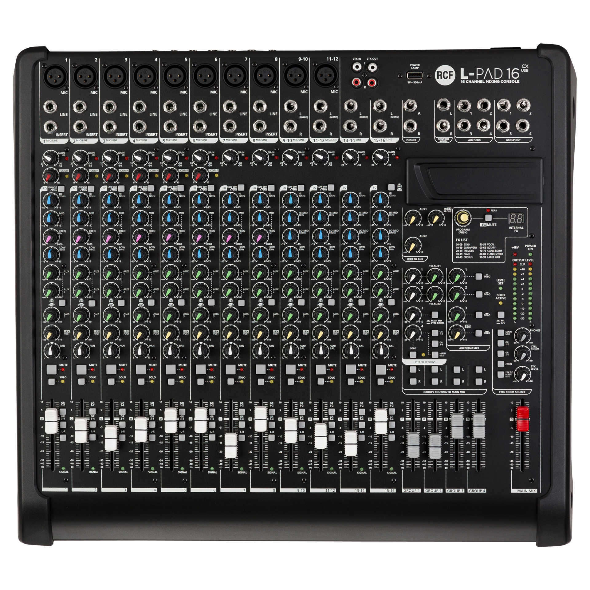 L-PAD 16CX профессиональная консоль для небольших концертов, студий и проката. Пульт имеет 10 микрофонных входов, 4 стереофонических линейных входа/выхода, 4 выхода Group, встроенный USB аудиоинтерфейс с 2 каналами записи и 2 каналами воспроизведения, а также 2TRACK вход/выход, 2 AUX PRE/POST посыла, 1 FX посыл и 4 выхода AUX. L-PAD 16CX имеет встроенный цифровой 24 битный DSP с 99 пресетами, а 6 компрессоров с единым управлением на микрофонных линейках позволяют обработать сигнал. 8 монофонических линейных входов с разрывом посыла/возврата дополнены 3-х полосным эквалайзером с полупараметрической серединой, и 4-полосные эквалайзеры фиксированной частоты на 4 стереоканалах.