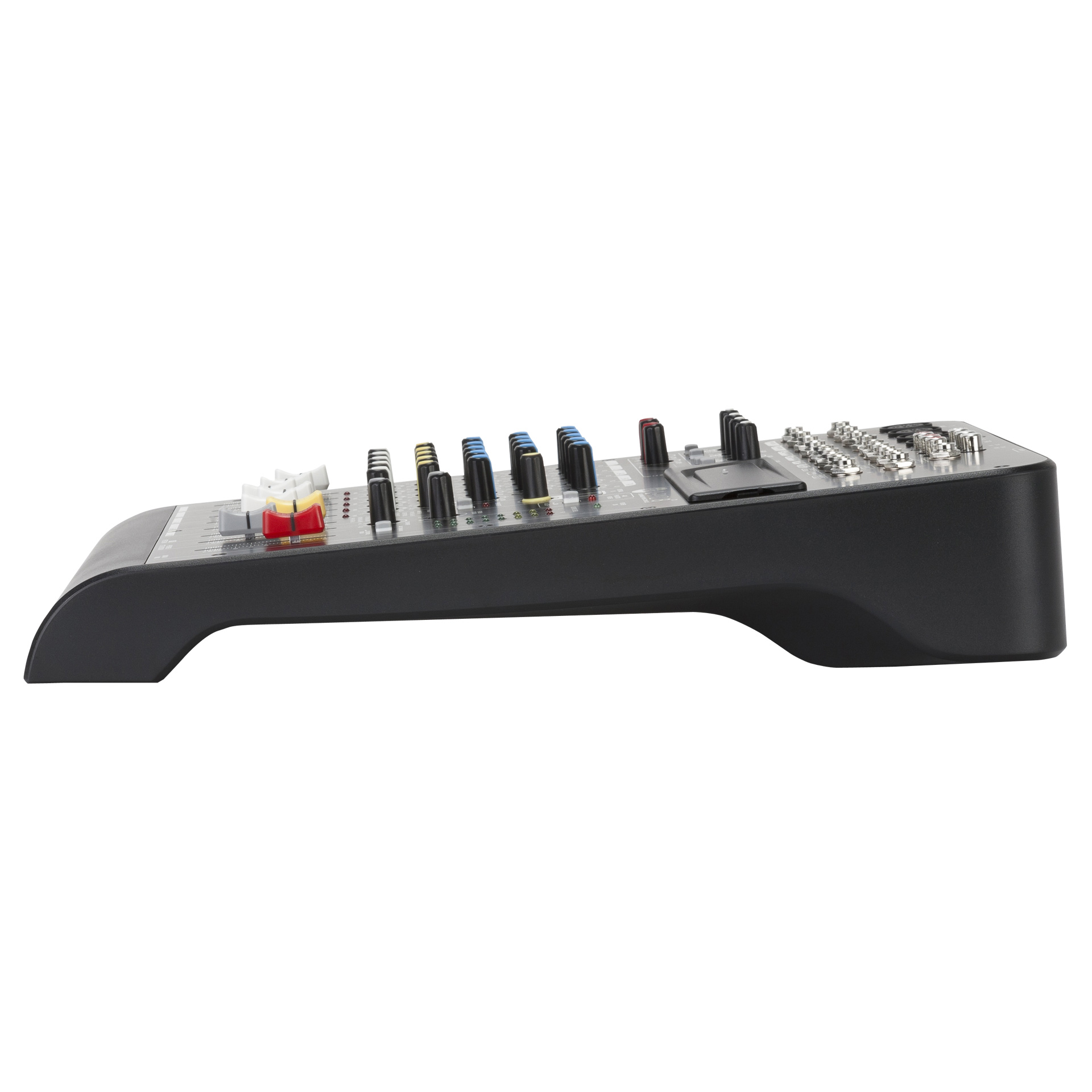 8 каналов, 4 микроф/лин. входа (+48V), 3 стерео входа, 45 мм фейдеры, встроенный компрессор+DSP FX, 99 пресетов,1 AUX SEND,3-х/2-х полосные EQ,НЧ фильтр 75 Гц,CONTROL ROOM, выход 2TRACK,внешний БП.