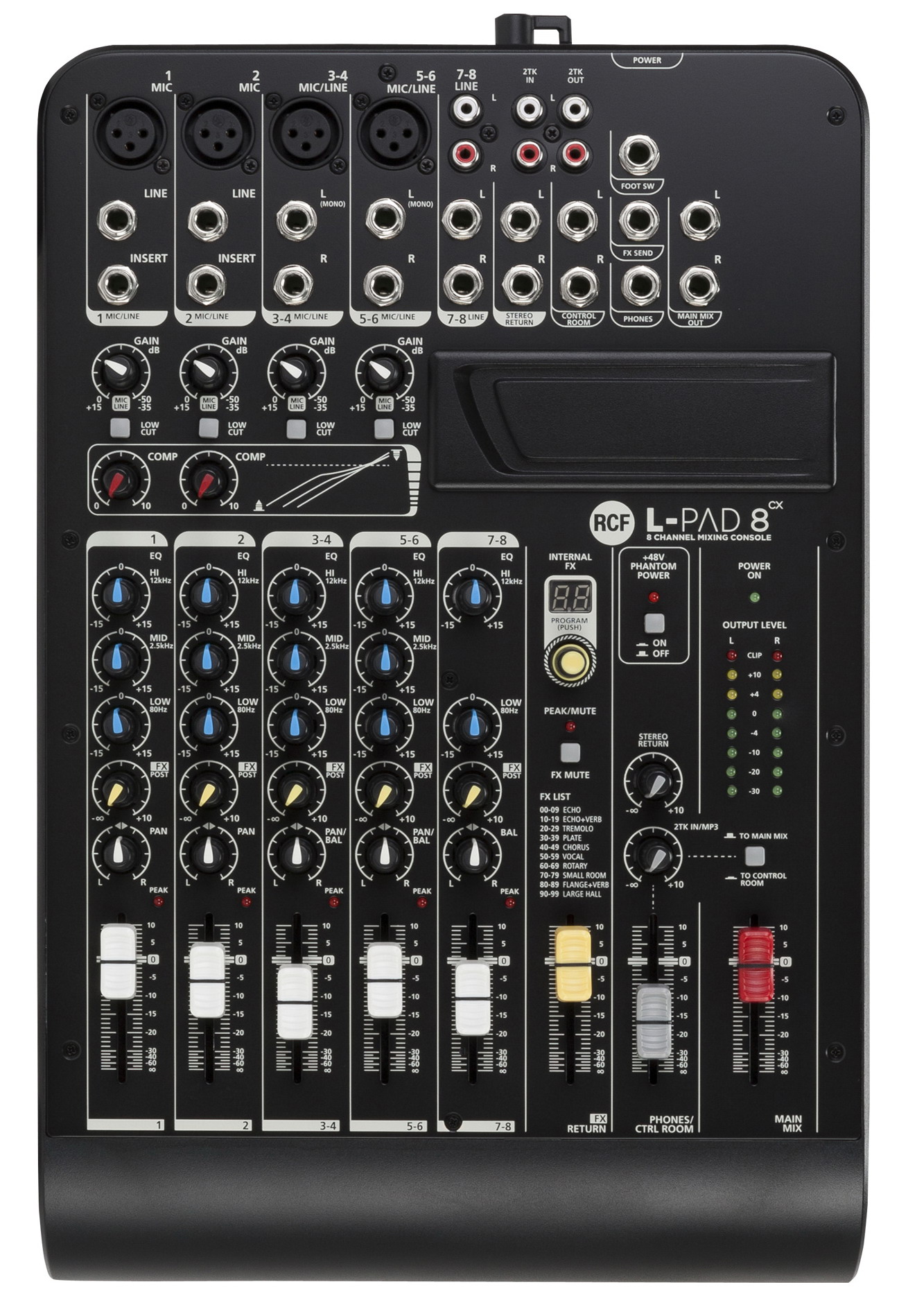 L-PAD PAD8CX является идеальным инструментом для рок групп и подготовки музыки на вечеринках. Пульт имеет 4 микрофонных входа, 3 стереофонических линейных входа/выхода, а также 2 TRACK вход/выход. Линейка L-PAD с приставкой "Х" имеет встроенный цифровой DSP с 99 пресетами, а 2 компрессора с единым управлением на микрофонных линейках позволяют обработать сигнал.