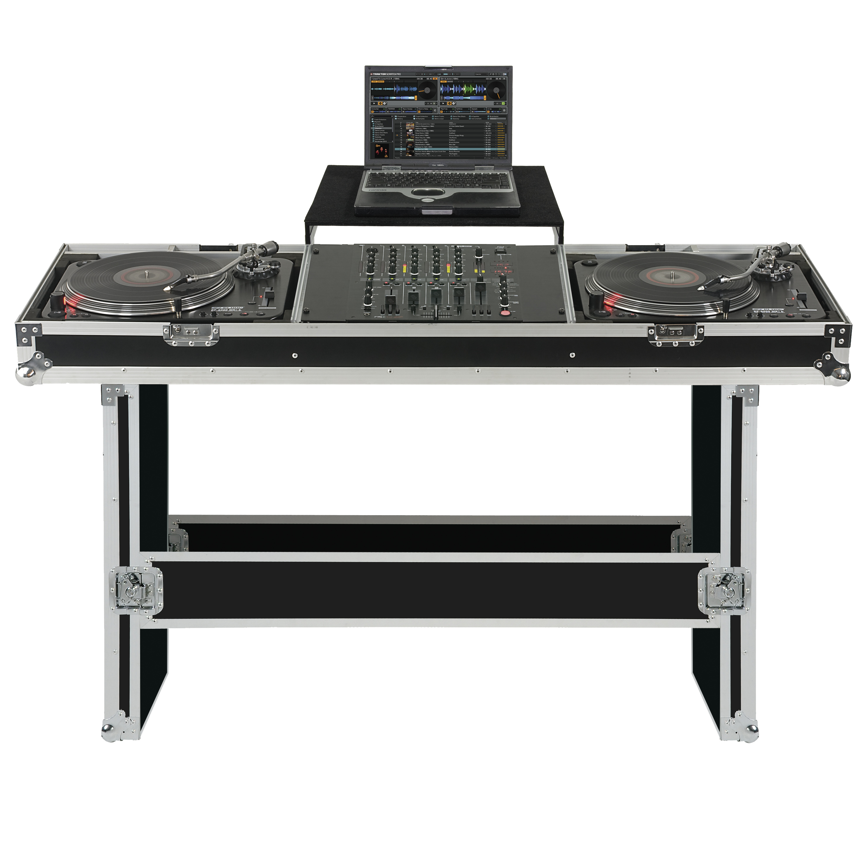 Кейс для двух проигрывателей виниловых дисков и микшерного пульта, полка для установки ноутбука, трансформация в стол-стойку, габариты: 1511x492x210 мм, вес: 28.5 кг, высота стола: 800 мм.